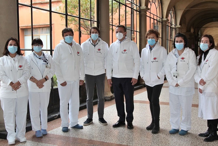 Il Dr. Luca Sangiorgi, il Direttore Generale Anselmo Campagna, l'assessore regionale Raffaele Donini, la direttrice scientifica Maria Paola Landini assieme al personale della struttura Malattie Rare Scheletriche impegnata nella gestione della help line.