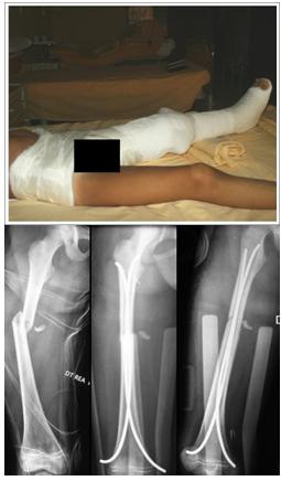In tutti questi casi si ricorre all’uso di fissatori esterni utilizzando possibilmente apparecchiature dinamizzabili. In tutti i casi l’uso di placche avvitate è da evitarsi così come risulta inopportuna la scelta di chiodi endomidollari rigidi fino alla chiusura delle cartilagini coniugali.