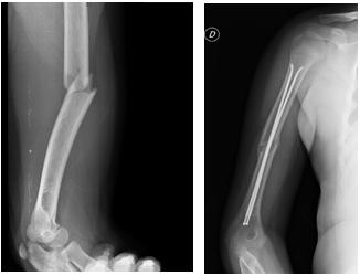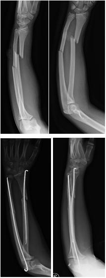 Nei pazienti più grandi (>9-10 anni), in cui aumenta l’incidenza di traumi ad alta energia e fratture comminute, è necessaria una riduzione più precisa e maggiormente anatomica. Se questa non è possibile o se si rilevano perdite di riduzione nei controlli radiografici in gesso l’intervento di osteosintesi diventa indispensabile. In genere la tecnica utilizzata è la endomidollare a cielo chiuso con chiodi in titanio secondo la tecnica di Nancy.