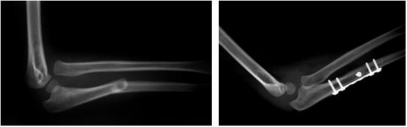 Per l'immobilizzazione post-operatoria è sufficiente una gomitera gessata con bendaggio reggibraccio. Successivamente in base all'evoluzione radiografica (callo di frattura) e alla stabilità dell'eventuale osteo-sintesi si deciderà se iniziare la mobilizzazione del gomito o proseguire con tutela (valva rimovibile o nuovo apparecchio gessato).