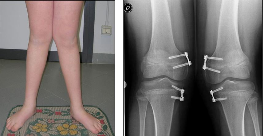 Qualora le deviazioni, idiopatiche o post-traumatiche, siano presenti in soggetti in crescita (in cui cioè è ancora presente attività della cartilagine di accrescimento o fisi) è possibile trattarle mediante un intervento chirurgico noto come epifisiodesi asim-metrica temporanea (Fig.2-3). Tale intervento sfrutta il potenziale di crescita residuo per “guidare” lo sviluppo favorendo la correzione del valgismo o del varismo. Ciò avviene mediante l’utilizzo di placchette lunghe pochi centimetri posizionate a cava-liere della/e fisi in grado di modulare l’accrescimento in tale sede. L’intervento pre-vede solo una piccola cicatrice, è descritta ampiamente una buona tollerabilità al do-lore grazie anche all’utilizzo di un’anestesia generale combinata con una loco-regionale del sito chirurgico.