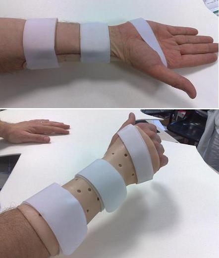 Un'opzione non chirurgica che spesso consente la risoluzione del quadro clinico consiste nell’utilizzo di un tutore dinamico di polso, eseguito su misura con materiale termoplastico, che permette di mantenere a riposo il tendine dell’estensore radiale breve del carpo grazie alla posizione obbligata del polso in estensione fissa a 12° (Fig. 2).