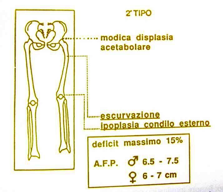 Alle caratteristiche proprie del 2° tipo sono da associare una più o meno grave displasia dell'acetabolo ed una coxa vara con valore sempre superiore ai 90°. Può essere presente una lieve ipoplasia della tibia. Il DPM è del 35%, l' AFP varia fra 14 e 17 cm nel maschio e fra 13,5 e 15,5 cm nella femmina.
