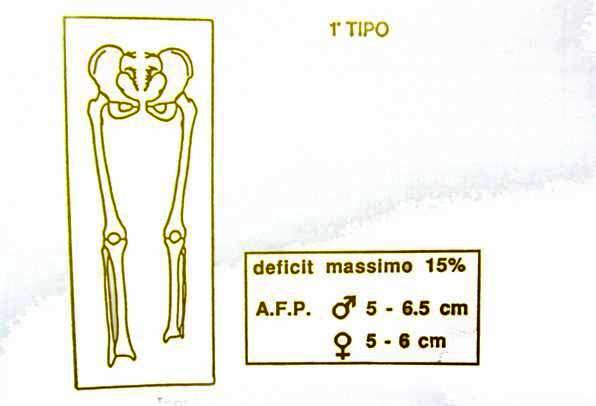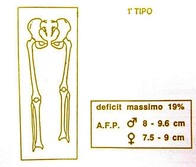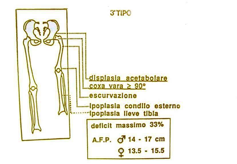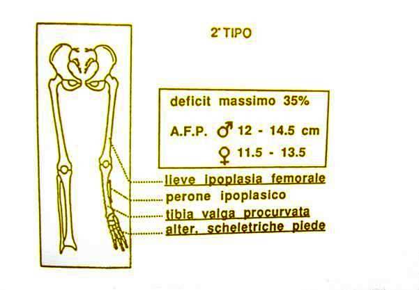 Il perone è conservato nella sua morfologia. E' presente a volte a lieve procurvazione tibiale ed un atteggiamento in valgo-procurvazione tibiale ed atteggiamento di valgo-pronazione del piede. Il DPM è del 15%, l'AFP varia fra 5 e 6,5 cm nel sesso maschile e tra 5 e 6 cm in quello femminile.