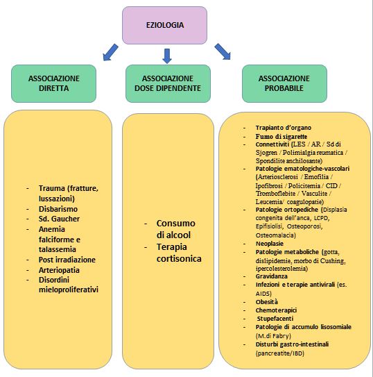 Esistono forme traumatiche e forme non traumatiche di osteonecrosi. Se nel primo caso è facile immaginare un’interruzione della perfusione ematica, nelle forme non traumatiche la patogenesi rimane difficile da definire e spesso è l’associazione di uno o più fattori di rischio, che predispongono a situazioni di ipercoagulazione e microtrombosi.