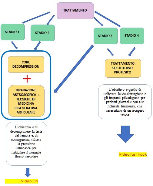 Negli stadi di osteonecrosi ove è già presente un danno condrale dovuto all’infarto osseo è neccessario associare il tempo di riparazione articolare.