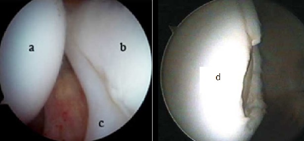 Figura 9: a-testa femorale, b- superficie acetabolare, c- labrum, d- lesione osteocondrale