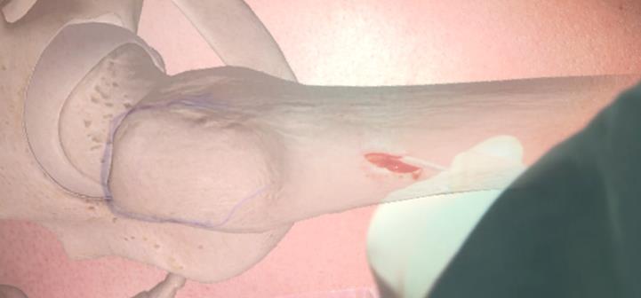 Il secondo tempo chirurgico è la procedura di core decompression con strumentario innovativo per la bonifica tridimensionale della lesione. Si esegue una piccola incisione di circa 1 cm distale al trocantere.