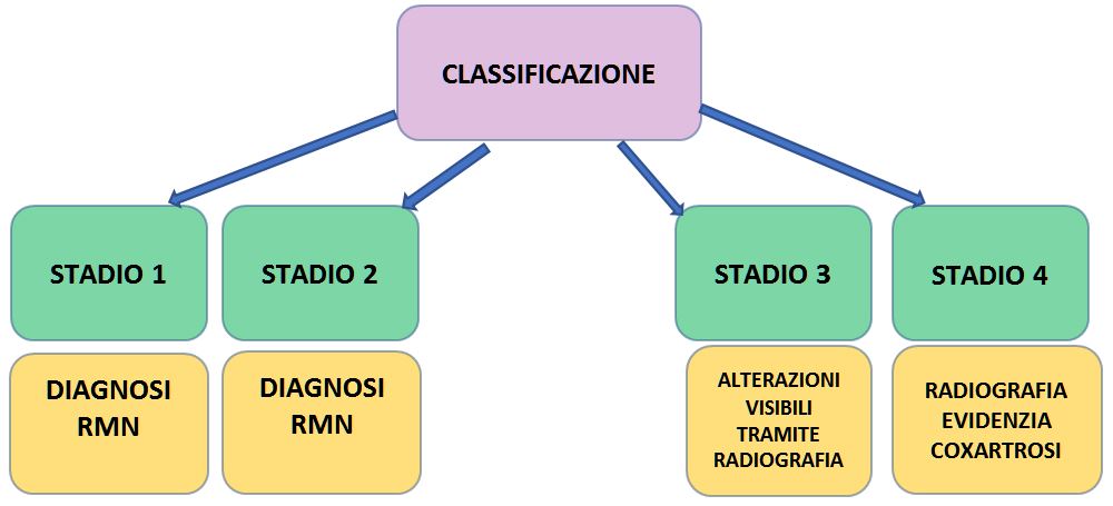 In particolare, lo stadio della patologia viene classificato secondo la classification de recherche osseous (ARCO) in 4 livelli basati su reperti radiografici e di risonanza magnetica.