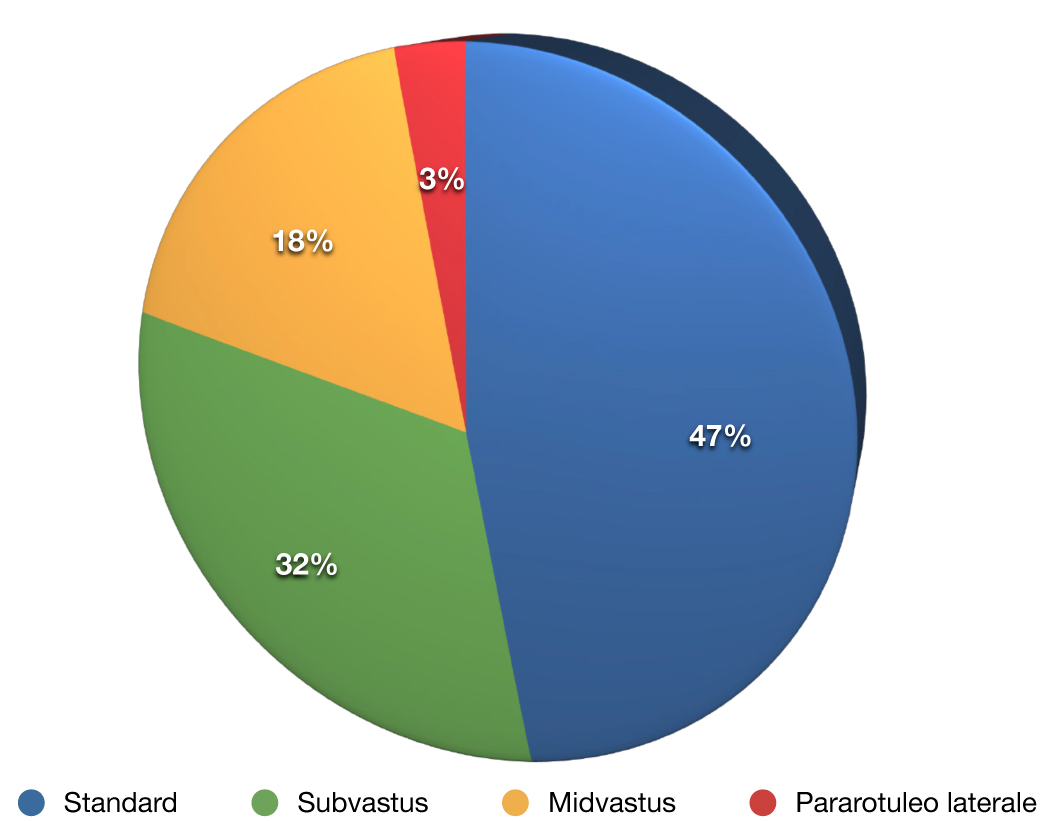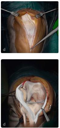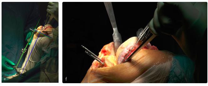 La tecnica chirurgica prevede diversi accessi scelti in base alle caratteristiche del ginocchio: accesso standard (47%) (d), sub-vastus (32%) e mid-vastus (18%) con artrotomia pararotulea mediale. In caso di gravi deformità in valgo è stato eseguito un acceso chirurgico standard con artrotomia pararotulea laterale (3%). L'impianto della protesi è guidato da un apposito strumentario che permette delle resezioni ossee precise per la correzione delle deformità assiali (e) e per l'impianto della protesi (f).
