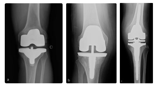 Le ginocchia con gravi deviazioni assiali sono state trattate con protesi con inserti a stabilizzazione posteriore (a), semivincolate (b) o vincolate (c).