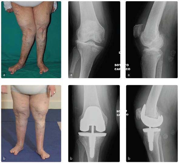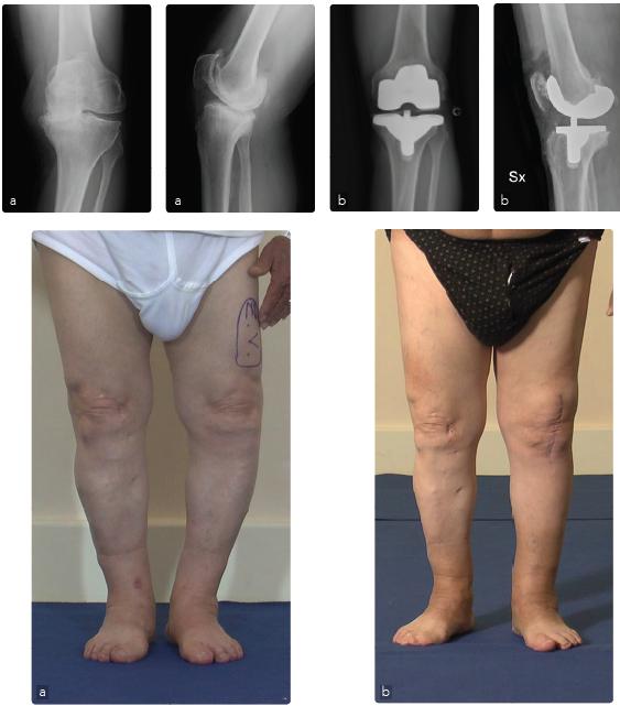 Femmina, 54 anni, affetta da gonalgia cronica in ginocchio valgo artrosico (valgismo >30°) (a). La deformità e l'artrosi comportavano una grave impotenza funzionale e dolore con deambulazione consentita per brevi tratti con l'ausilio di un bastone. Il trattamento chirurgico è consistito nella correzione dell'asse del ginocchio e una sostituzione protesica con protesi parzialmente vincolata (b). La paziente in seguito all'intervento è tornata a deambulare senzo bisogno dell'ausilio di bastoni, ed a salire e scendere autonomamente le scale.