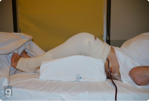 Il laccio emostatico è stato utilizzato in casi selezionati e per breve tempo (media 30 minuti), è stato sempre rilasciato prima della cementazione, consentendo un’emostasi accurata che, associata a tecniche anestesiologiche d’avanguardia e protocolli riabilitativi innovativi quali il mantenimento del ginocchio in flessione su cunei in gommapiuma nelle prime 24-48 ore (g), ha permesso di ridurre considerevolmente le perdite ematiche. Il conseguente tasso di trasfusione è stato solo del 29%.