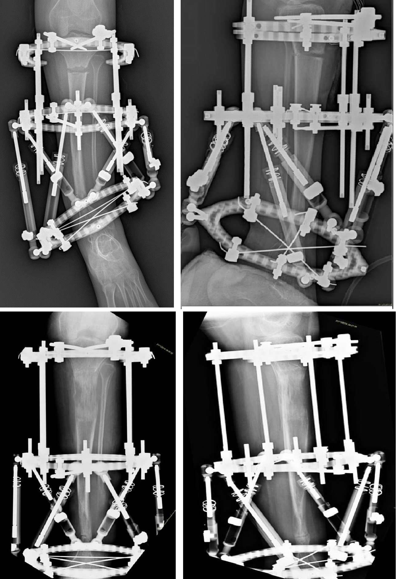 2) Secondo tipo di fissazione si ottiene mediante uso di fissatore esterno (Ilizarov o moderni esapodali), in genere utilizzato nei pazienti più grandi, come  intervento definitivo  per correggere le deformità residue e l'accorciamento dell'arto oppure per trattare la pseudoartrosi e contemporaneamente recuperare l'accorciamento associato o meno ad adiuvanti biologici.