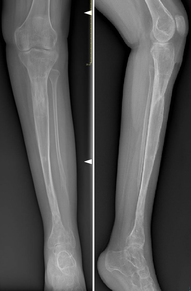 Fig.1-2: rx AP e LL – Pseudoartrosi congenita di tibia, incompleta consolidazione al terzo distale tibiale e peroneale con deviazione assiale in valgo e procurvazione