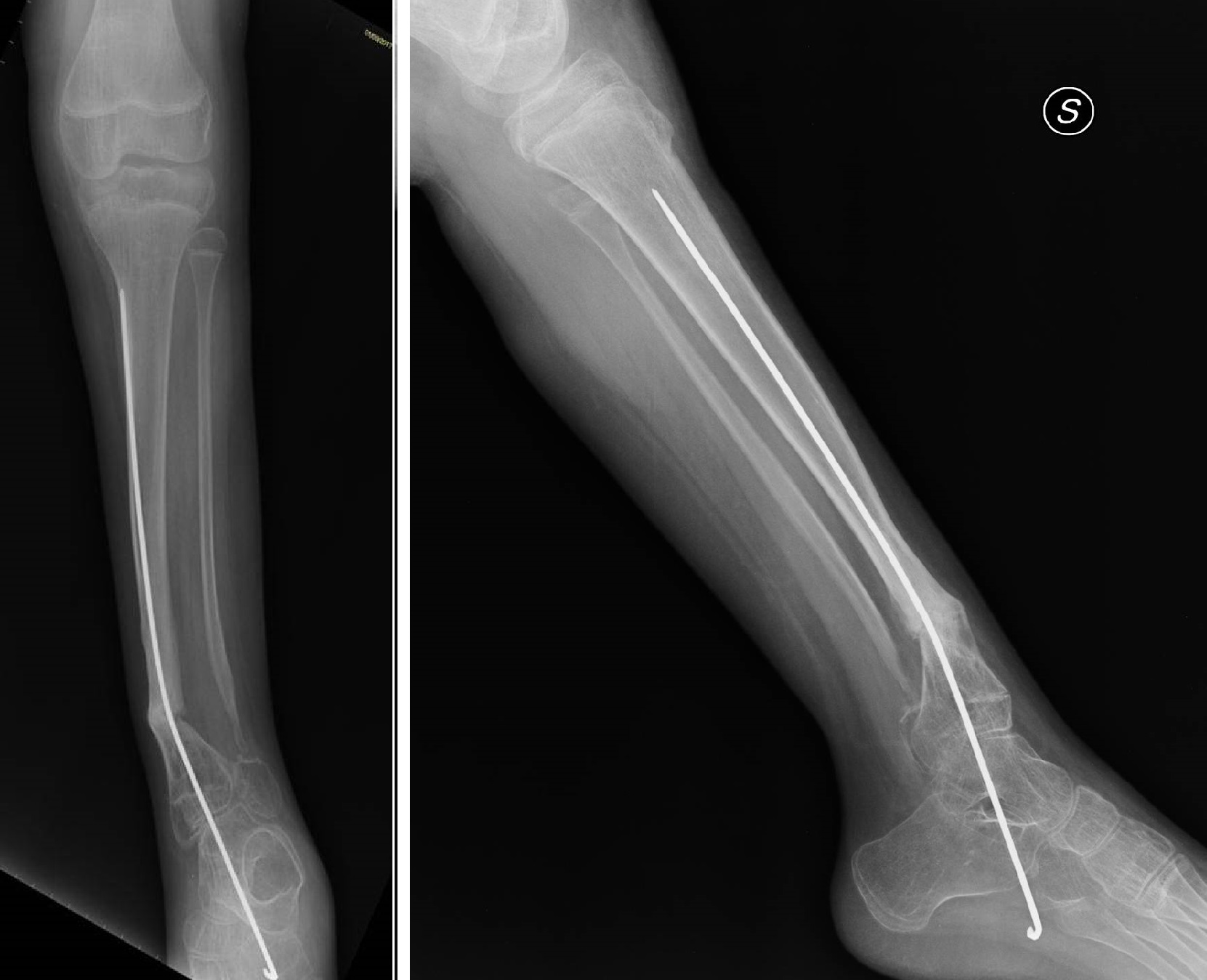 Quando le condizioni  lo consentono si possono utilizzare chiodi telescopici che hanno il vantaggio di ridurre l'accorciamento definitivo della tibia a fine crescita e di essere sostituiti meno frequentemente, perché consentono di allungarsi  (entro certi limiti) durante la crescita in lunghezza della tibia del paziente.