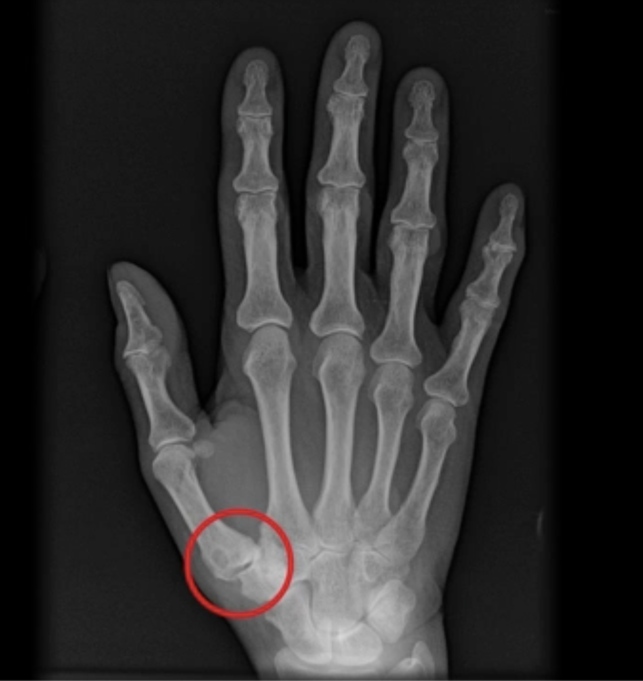 Il sintomo principale della rizoartrosi è il dolore alla base del pollice, che può irradiarsi lungo il dorso del pollice. Nelle fasi iniziali, il dolore si manifesta durante movimenti specifici come girare una chiave o aprire un barattolo. Con il tempo, il dolore può diventare costante e più intenso, limitando le attività quotidiane. Negli stadi avanzati, l'articolazione può anchilosarsi (bloccarsi), riducendo il dolore ma limitando ulteriormente il movimento del pollice. La base del metacarpo può diventare ipertrofica e irregolare.
