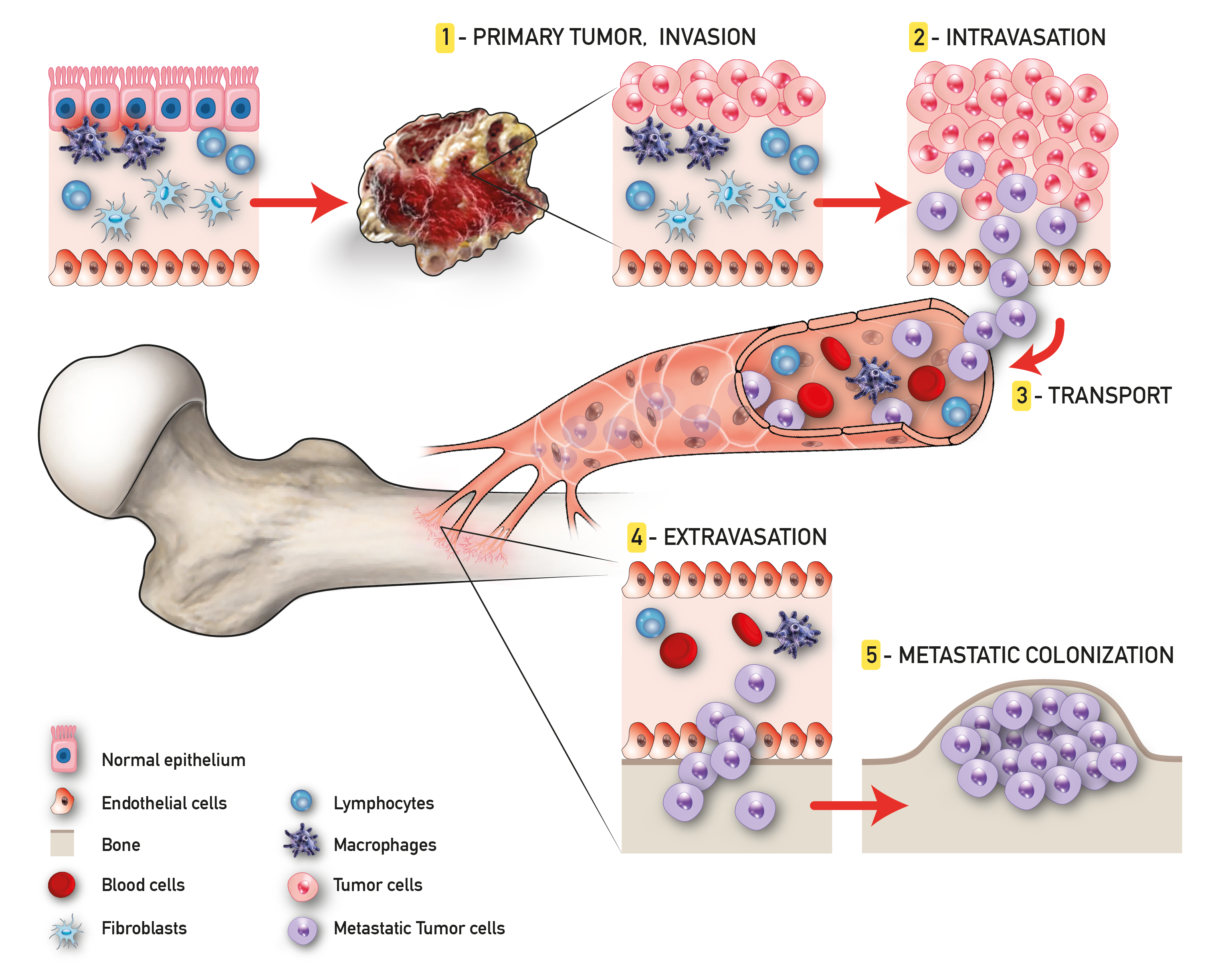 L'immagine rappresenta le diverse fasi del processo di metastatizzazione, che comincia precocemente durante la formazione del tumore e coinvolge il microambiente tumorale, ma anche cellule del sistema immunitario richiamate nel tumore primitivo e negli organi che saranno colonizzati dalle cellule tumorali. Uno degli argomenti di ricerca di SS MATI è lo studio approfondito di tute le fasi di questo processo.