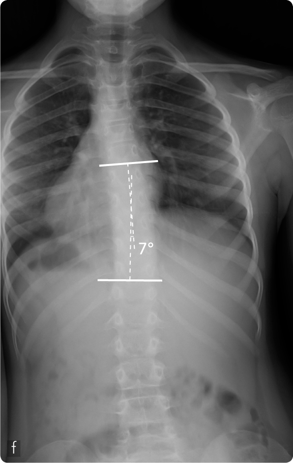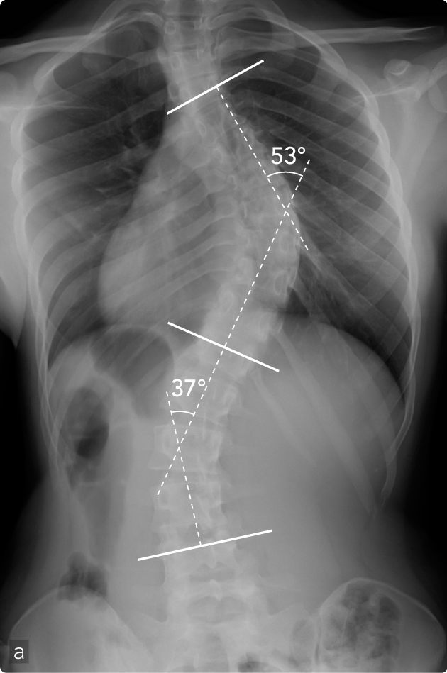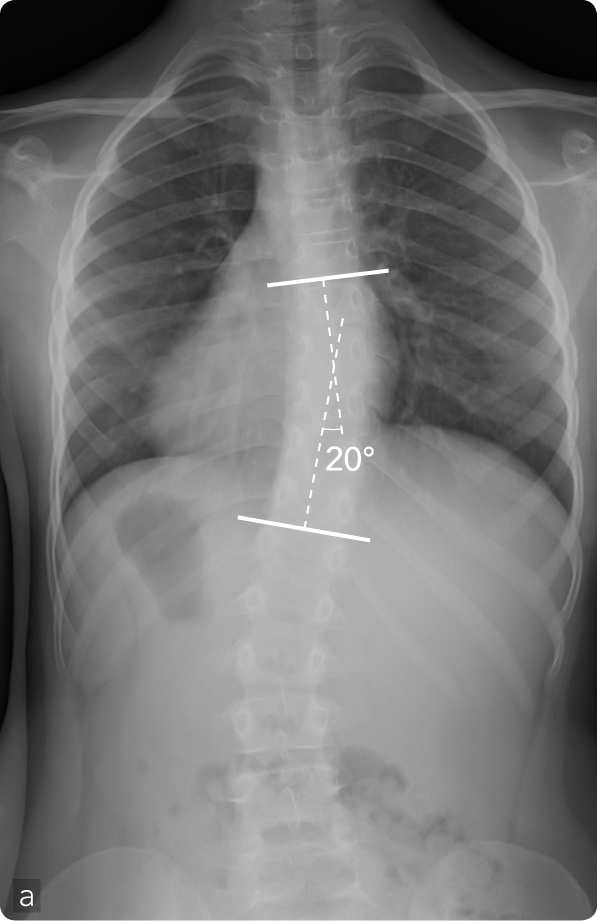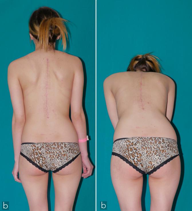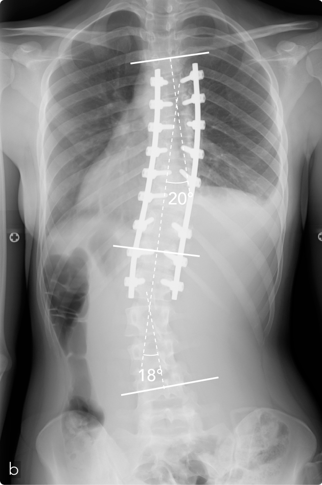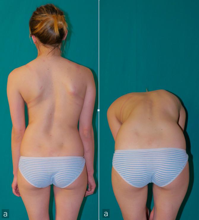 Femmina, 15 anni, scoliosi idiopatica. All'esame ispettivo si apprezza asimmetria dei fianchi, lo sbilanciamento delle spalle rispetto al bacino, la presenza del gibbo dorsale destro alla flessione anteriore del tronco (a). La radiografia mostra scoliosi toracica destra con compenso non strutturato lombare. Operata di artrodesi breve posteriore strumentata (b) con buon risultato estetico e funzionale. Si apprezza al controllo evolutivo buon bilanciamento della colonna vertebrale. Riduzione della deformità toracica da 53° a 20° secondo Cobb e della lombare da 37° a 18° secondo Cobb.
