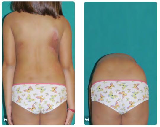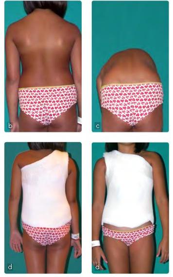 Femmina, 8 anni, scoliosi dorsale destra (a). Asimmetria del profilo delle scapole e dei fianchi (b) ed evidente gibbo dorsale destro (c). Trattamento con busto gessato in deflessione (d). Obiettiva riduzione del gibbo ai controlli successivi in particolare alla flessione anteriore del tronco (e) confermata dal controllo radiografico (f).