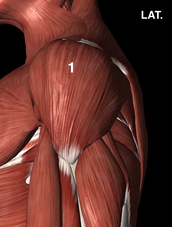 Fig. 2 - Visione laterale dell'anatomia muscolare della spalla (1, muscolo deltoide)