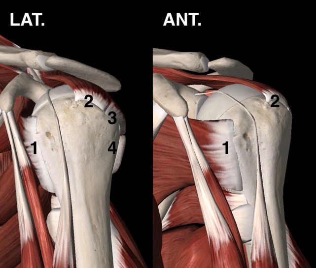 Fig. 3 - Visione anteriore e laterale dell'anatomia muscolare della spalla (tendini dei muscoli della cuffia dei rotatori: 1, tendine del muscolo sottoscapolare; 2, tendine del muscolo sovraspinoso; 3, tendine del muscolo sottospinoso; 4, tendine del muscolo piccolo rotondo)