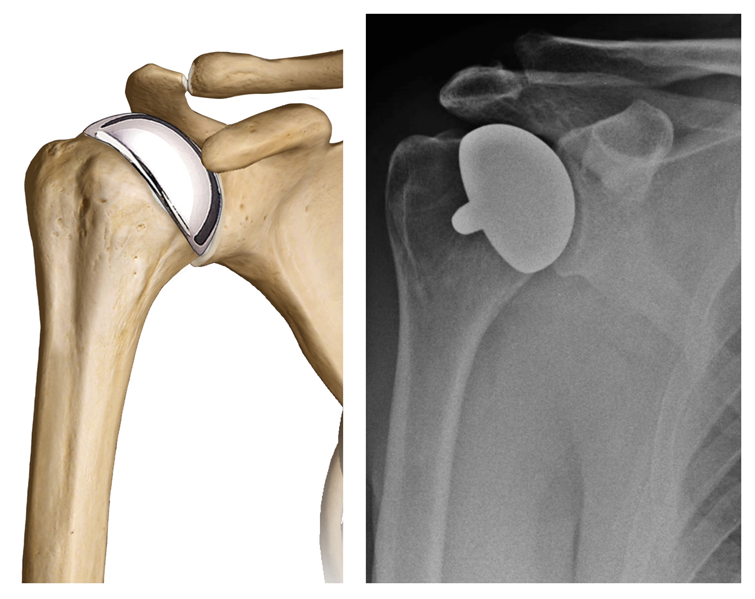 • Protesi di spalla di rivestimento o “emicefalica” (fig. 8): comporta la sostituzione della superficie articolare della testa omerale con una protesi a cappuccio senza stelo. Può essere un'opzione valida se (a) la superficie articolare glenoidea è intatta; (b) il collo o la testa omerale non presentano fratture; (c) in pazienti giovani o molto attivi, evitando così i rischi di usura e allentamento delle componenti che potrebbero verificarsi con le sostituzioni convenzionali totali di spalla. Inoltre data la sua natura più conservativa, la protesi emicefalica può essere più facile da convertire in protesi totale di spalla quando necessario.