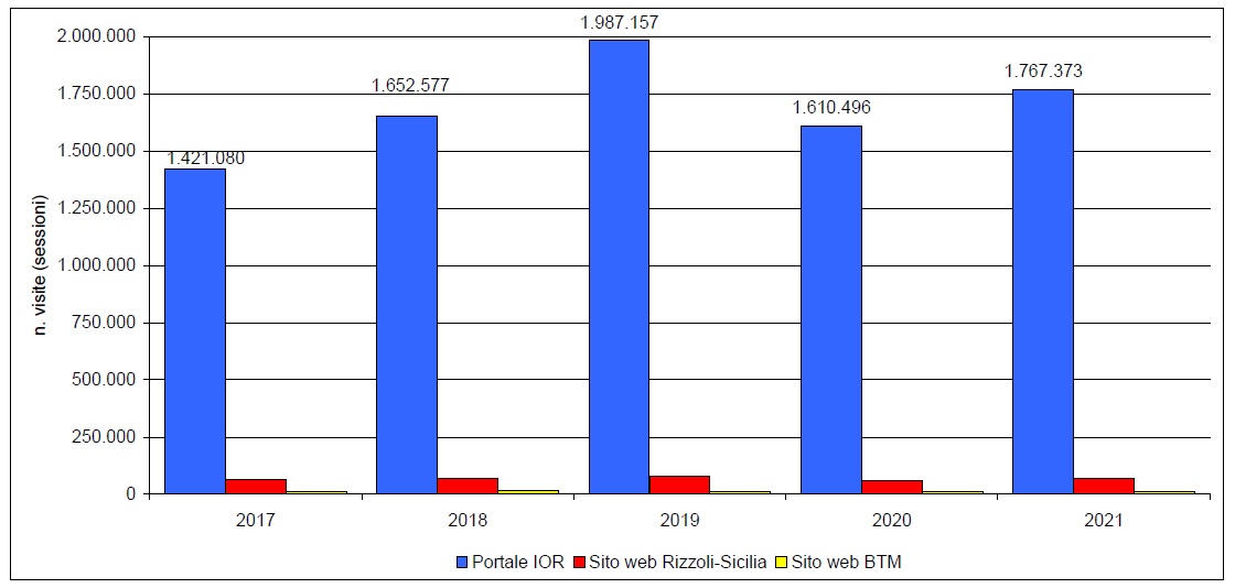 Nel corso del 2024 il portale web dell'Istituto Ortopedico Rizzoli (www.ior.it, btm.ior.it, drs.ior.it) ha avuto 2.084.141 visite (sessioni), con una media giornaliera di 5.694 visite. Le visite erano state 1.861.535 nel 2023 (media giornaliera di 5.101 accessi). La variazione del 2024 sul 2023 è pertanto pari a +12,0%.