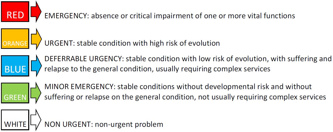 Access to Emergency is regulated by the Triage Emergency System that selects patients according to severity, reducing to a minimum waiting times for urgent patients. The grade of severity is classified by a colour code: