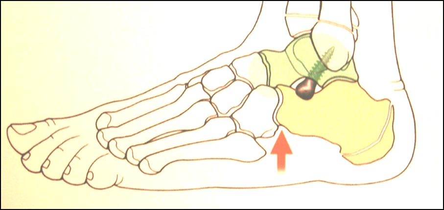 - Calcagno-stop: Tramite una piccola incisione nel seno del tarso si infigge una piccola vite all’interno dell’astragalo (osso della caviglia), la parte terminale della vite, che presenta un’ingombro maggiore (di solito sferica), viene a trovarsi in questo modo nel seno del tarso e si oppone in questa maniera alla pronazione del calcagno (osso del tallone), correggendo la pronazione e facendo risalire la volta plantare.