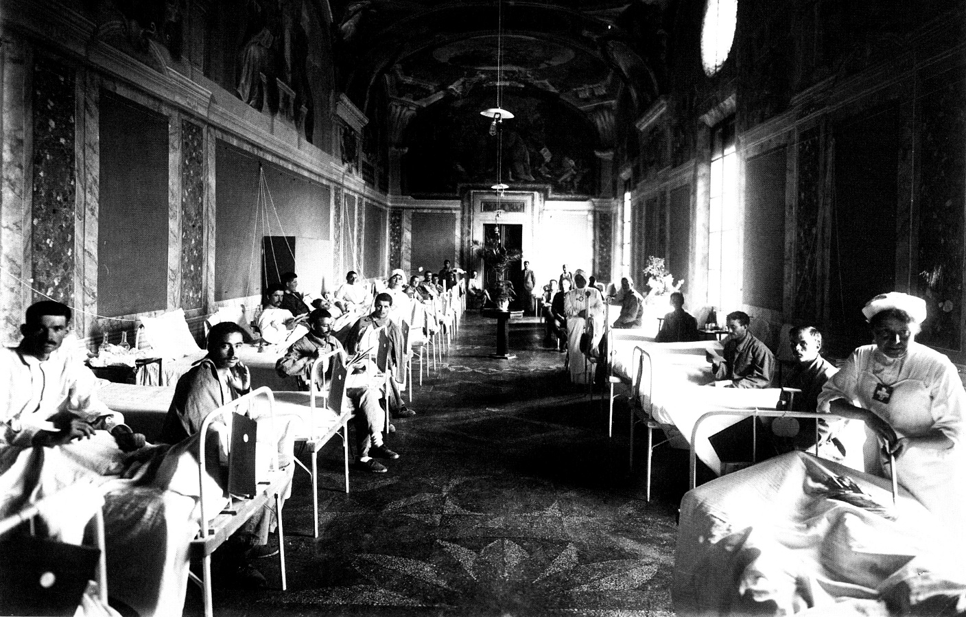 La sala centrale della biblioteca usata come reparto di degenza durante la prima Guerra Mondiale