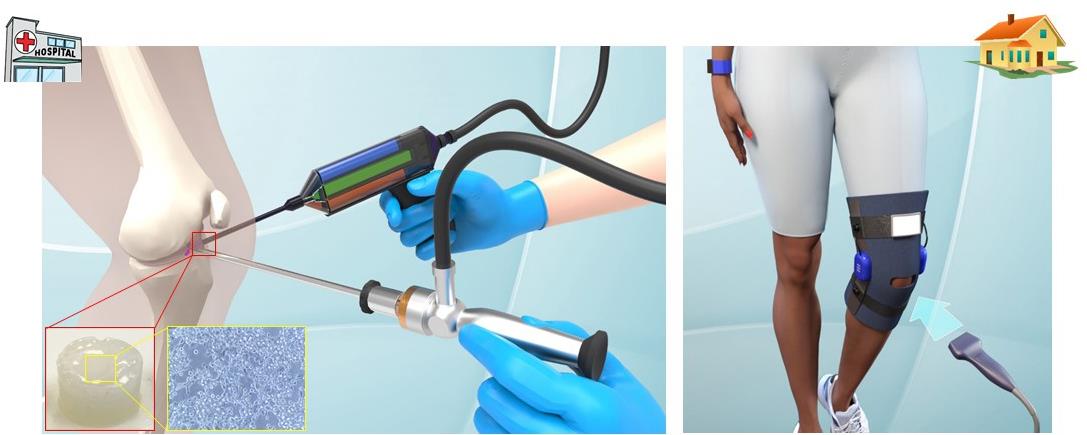 L’invenzione vuole sostituire il bisogno di iniezioni ripetute per la rigenerazione dei tessuti e/o gli interventi chirurgici per la sostituzione dell’intera giunzione articolare. L’invenzione infatti è un materiale composito a base organica rilasciato da una stampante 3D integrata in un tool artroscopico. Il materiale composito viene inserito una volta sola nel sito di interesse, e consente di rigenerare il tessuto attraverso la stimolazione esterna del sito d’intervento, anche a distanza nel tempo senza dover intervenire chirurgicamente ogni volta che si palesi la necessità del trattamento. Inoltre è stato pensato un sistema di gestione del trattamento in maniera intelligente e integrata a App per il monitoraggio a distanza da parte di personale specializzato. Questo avrebbe un impatto notevole considerando che la necessità di ospedalizzazione per pazienti anziani potrebbe essere evitata o quantomeno ridotta nel tempo grazie al monitoraggio a distanza.