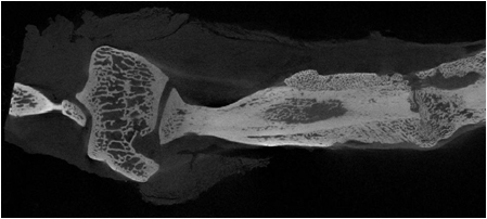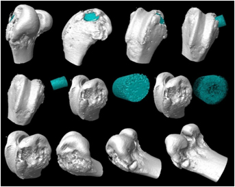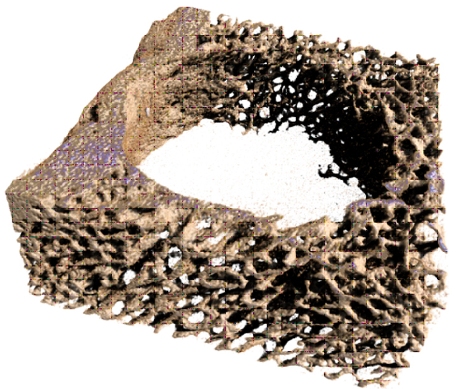 - studio della morfologia dell’osso, estremamente importante perché numerose patologie ne alterano la microarchitettura (osteoporosi e altre patologie o terapie che influenzano il tessuto osseo). Inoltre, dopo l’impianto di un biomateriale è importante non solo valutare quantitativamente la crescita ossea, ma anche la qualità dell’osso rigenerato. Oltre alle analisi istomorfometriche 3D, vengono creati, partendo dalle sezioni micro-CT, modelli tridimensionali virtuali che forniscono visualizzazioni realistiche del campione di grande utilità anche per comprenderne appieno le strutture.