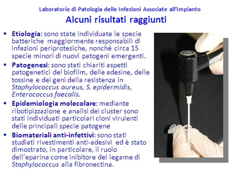 - Raccolta, classificazione e conservazione dei ceppi isolati da infezioni chirurgiche e periprotesiche. Conservazione nella Ceppoteca del Laboratorio di Patologia delle infezioni associate all'impianto (attualmente oltre 2.700 ceppi);