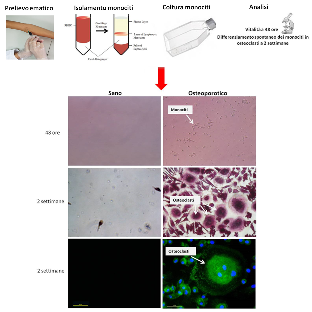 Il nuovo metodo, oggetto della presente invenzione, si basa sulla spontanea abilità di differenziazione osteoclastica di popolazioni monocitarie circolanti, purificate da pazienti con condizioni patologiche associate all'osteoporosi, anche in uno stadio precoce. Il metodo è un test diagnostico facile, rapido, non invasivo ed economico che necessita di solo 1 ml di sangue per essere eseguito, pertanto può essere adottato come test di screening di routine da qualsiasi laboratorio di analisi cliniche in quanto compatibile con le normali attività di analisi del sangue.